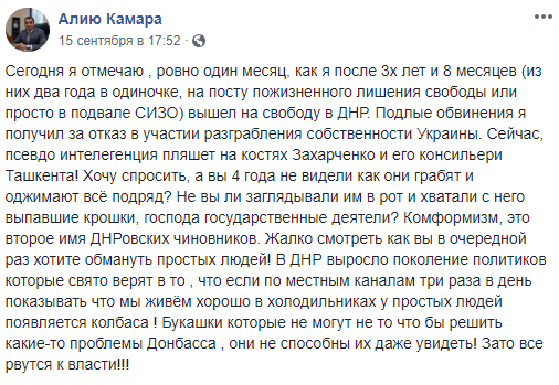 3 года и 8 месяцев Камара провел в СИЗО. Он освободился чуть более месяца назад, о чем говорится в его последнем посте в Фейсбуке. Экс-"министр" пишет, что настоящая причина его заключения в том, что он отказался участвовать в разграблении собственности Украины, которым занимался покойный Захарченко со своей "свитой".