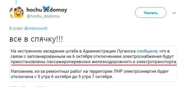 Сообщается, что ремонтные работы будут проводиться на участке линии 500кВ «Победа - Шахты» с 00.00 6 октября до 05.00 7 октября, в связи с чем "временно будет ощутим дефицит мощности электрической энергии на территории ЛНР". Для обеспечения электричеством социально важных объектов будут задействованы генераторы.