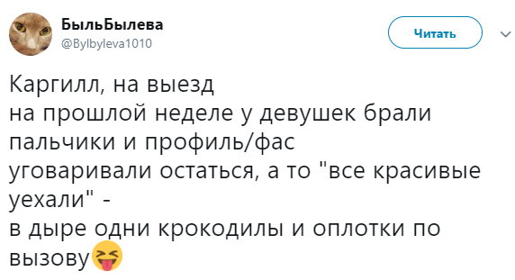 "Каргилл, на выезд на прошлой неделе у девушек брали пальчики и профиль/фас уговаривали остаться, а то "все красивые уехали" - в дыре одни крокодилы и оплотки по вызову", - пишет пользователь Твиттера.