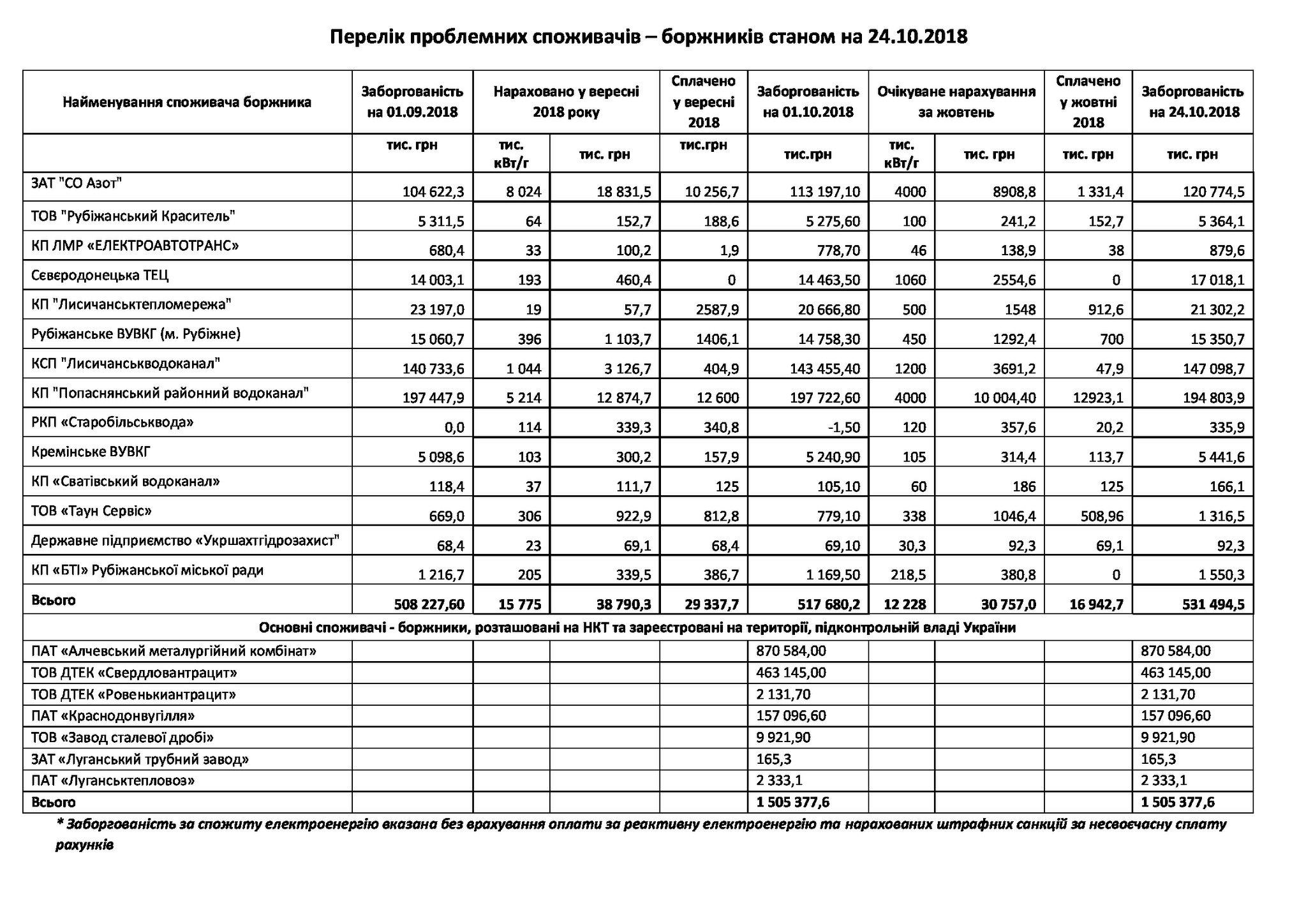 На странице в фейсбуке энергоснабжающего предприятия опубликован список наибольших должников с комментарием: «...из-за быстро растущего долга в размере более 143 млн грн. без воды останутся десятки тысяч людей на прифронтовой территории, полностью в населенных пунктах Приволье, Новодружеск, Малорязанцево и частично - в Лисичанске. В частности, в Лисичанске без воды окажутся район РТИ и часть города вместе со стекольным заводом «Пролетарий».
