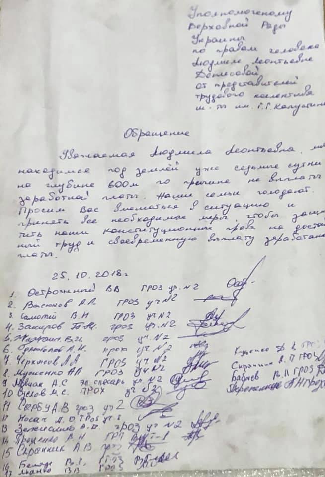 К протестующим шахтерам сегодня спустился представитель Уполномоченного Верховной Рады по правам человека в Донецкой и Луганской областях Павел Лисянский. Через него горняки передали обращение к омбудсмену Людмиле Денисовой.
