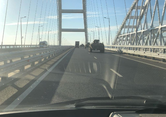 На незаконно построенном оккупантами мосту через Керченский пролив заметили колонну российской военной техники.