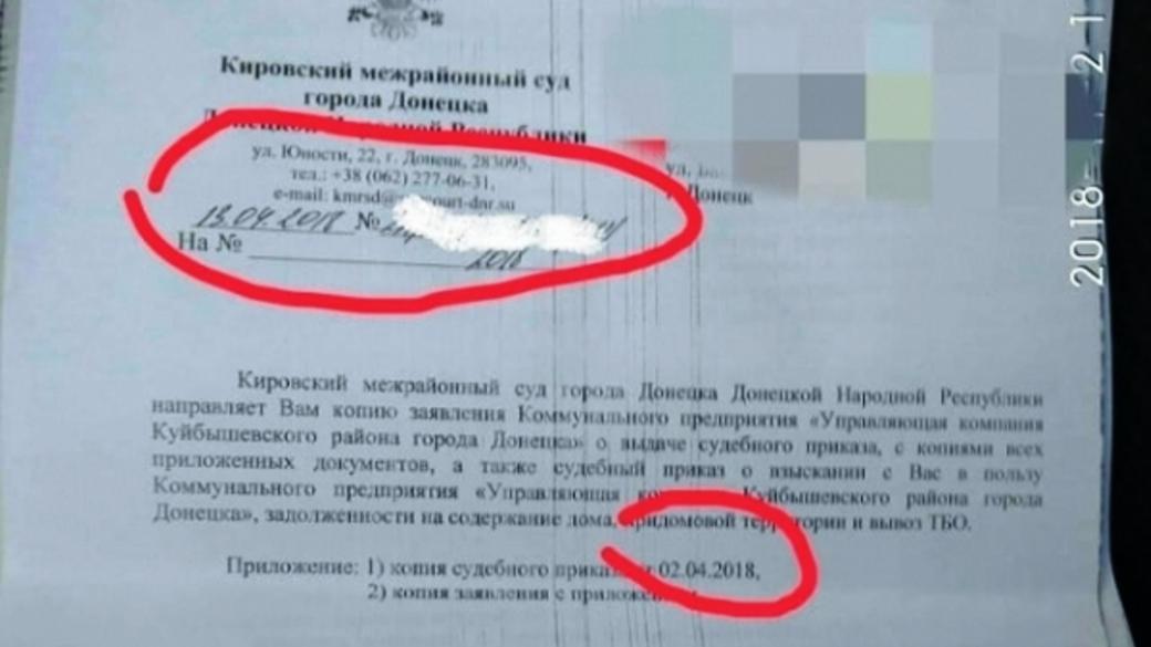 Жители временно оккупированного Донецка в последнее время активно получают письма из так называемых "судов" о взыскании долгов за услуги ЖКХ в пользу коммунальных предприятий. Об этом дончане сообщают в социальных сетях, передает Час Пик.