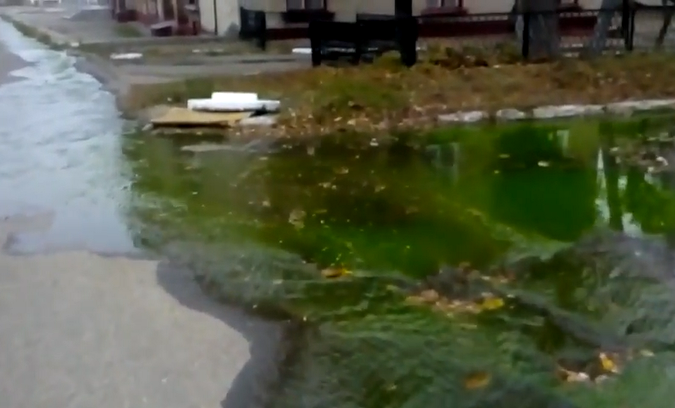 По словам автора ролика, зеленая "минералка" течет прямо к горисполкому. Из какой трубы появилась такая вода, не сообщается.