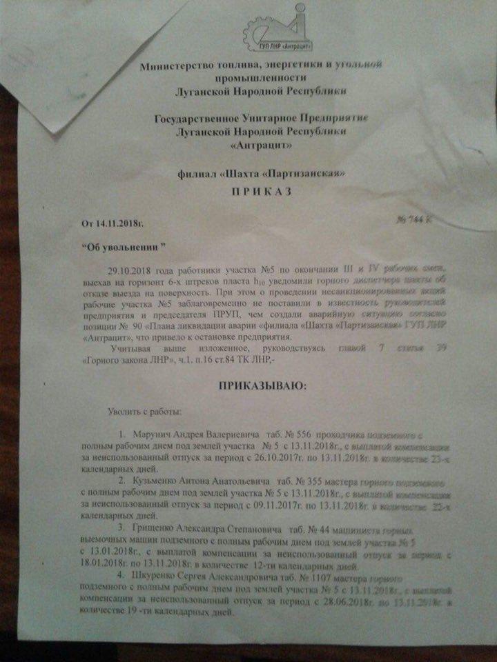 В сети обнародован "документ" об увольнении четверых работников шахты из-за протеста. Как сообщил в соцсети представитель омбудсмена на Донбассе Павел Лисянский, были уволены только зачинщики забастовки. Новость передает Час Пик.