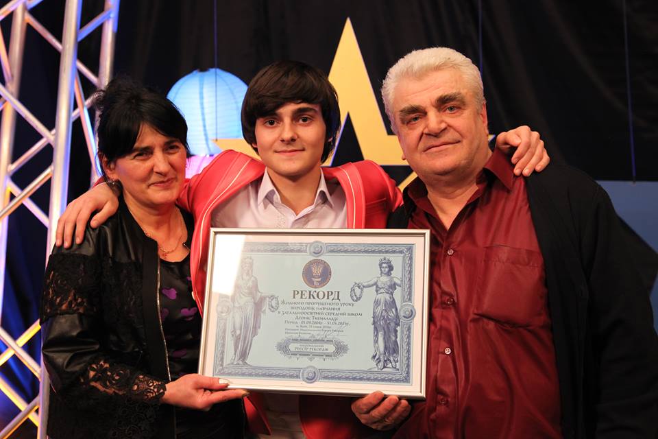 "Харьковчанин Деонис Ткемаладзе своим достижением удивил даже опытных экспертов по рекордам: ни одного пропущенного урока в течение 11 лет обучения в общеобразовательной средней школе! Добросовестный ученик Украины подтвердил свое достижение дневниками и школьными журналами за 11 лет. А справку, подтверждающую это достижение, подписал не только директор школы, но и еще 18 педагогов", - написала она.