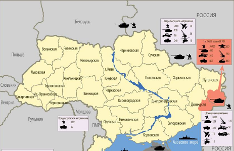 Украинский депутат, журналист Дмитрий Тымчук предоставил подробную информацию о расположении и количестве военных и технике вблизи украинской границы на своей странице в соцсети Facebook, передает Час Пик.
