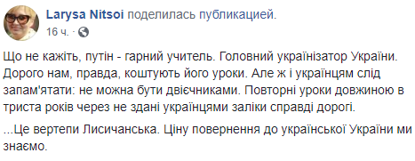 "Что ни говорите, путин - хороший учитель. Главный украинизатор Украины. Дорого нам, правда, стоят его уроки. Но и украинцам следует запомнить: нельзя быть двоечниками. Повторные уроки длиной в триста лет из-за не сданных украинцами зачетов действительно дорогие", - написала Ницой.