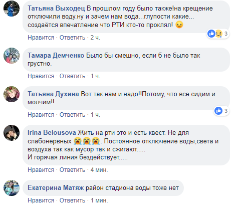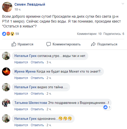 "Просидели на днях сутки без света (р-н РТИ 1 микро). Сейчас сидим без воды. Я так понимаю, проходим квест "Остаться в живых"?" - написал один из пользователей Фейсбука.