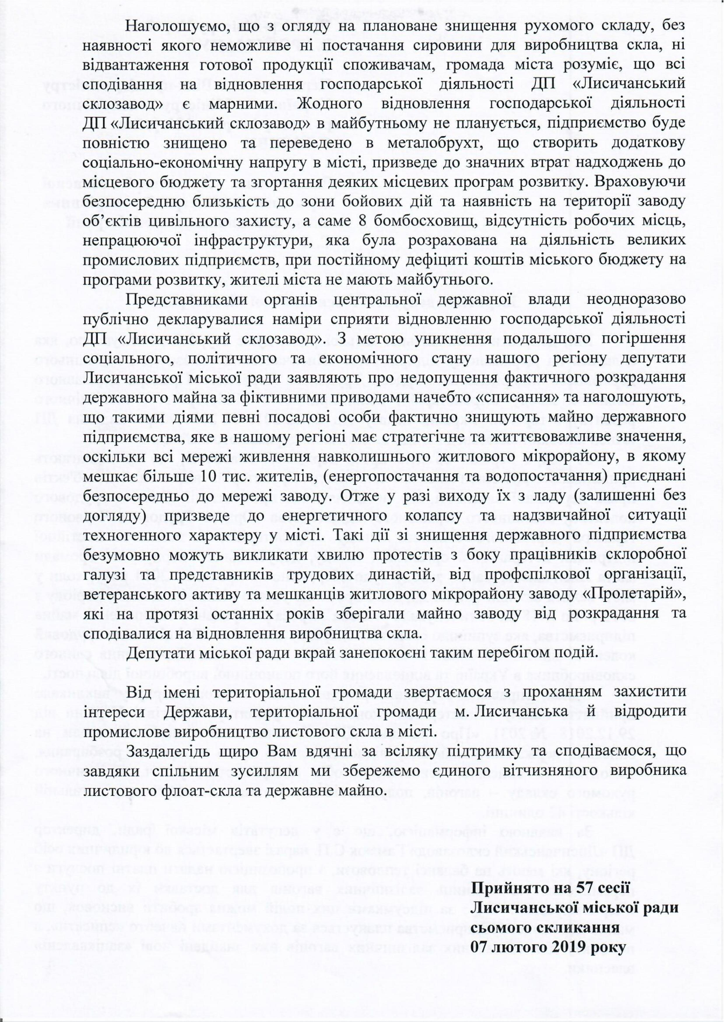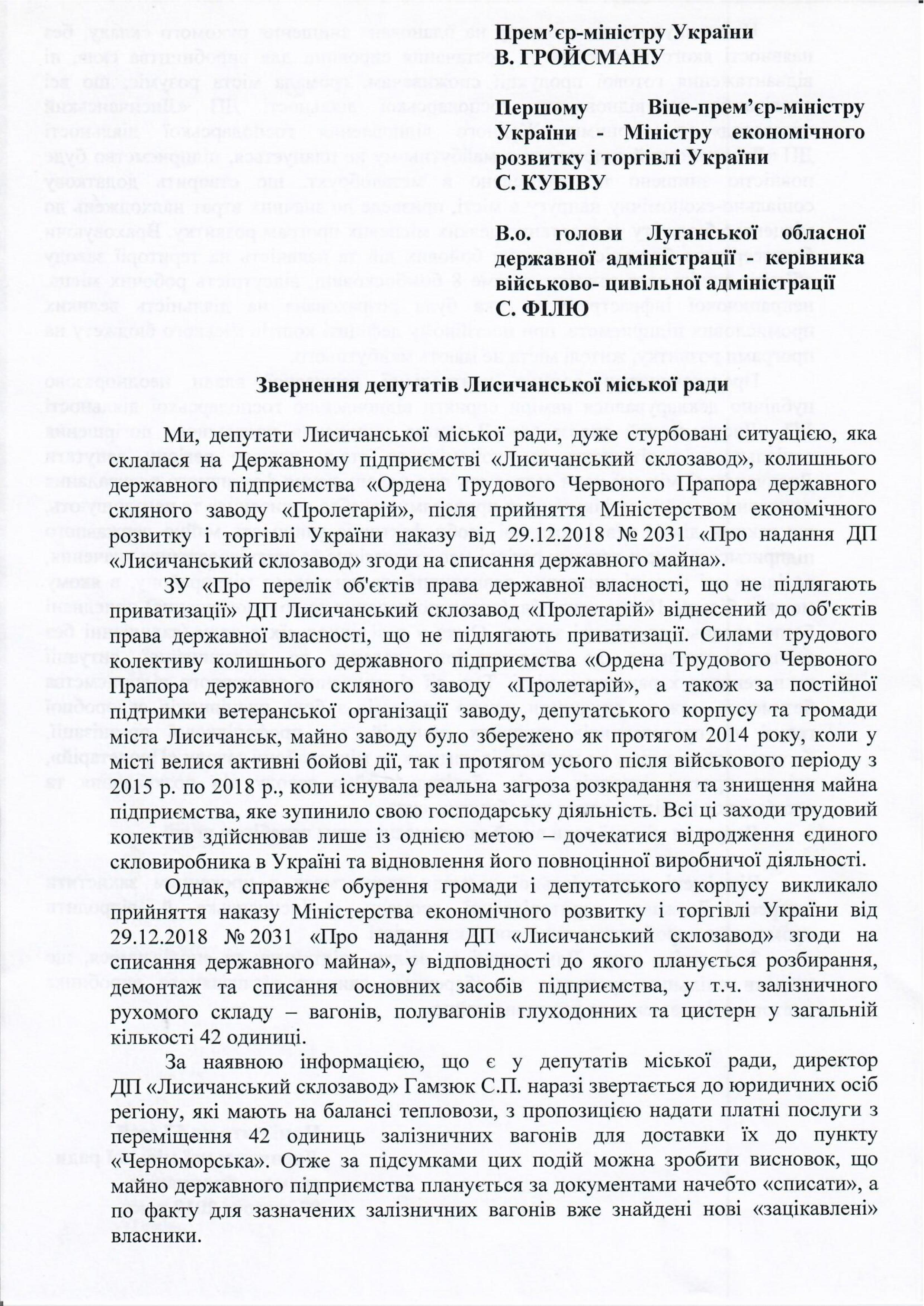 Лисичанские депутаты поддержали обращение к Премьер-министру Украины Владимиру Гройсману, Первому вице-премьер-министру Украины - Министру экономического развития и торговли Украины Степану Кубиву, председателю Луганской областной государственной администрации - военно-гражданской администрации Сергею Филю относительно защиты интересов государства, территориальной громады г. Лисичанска и возрождения промышленного производства листового стекла в городе.