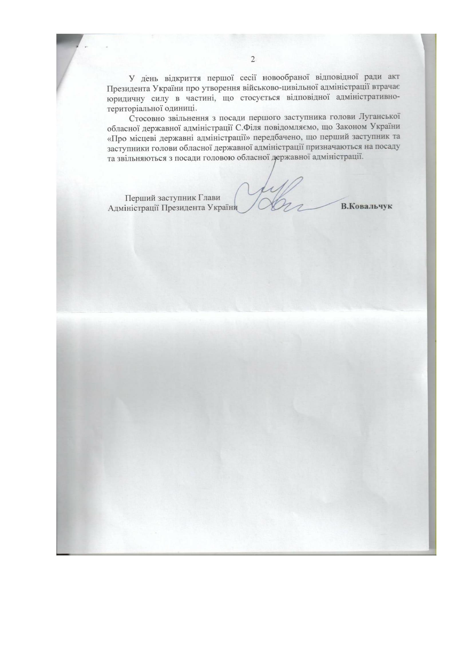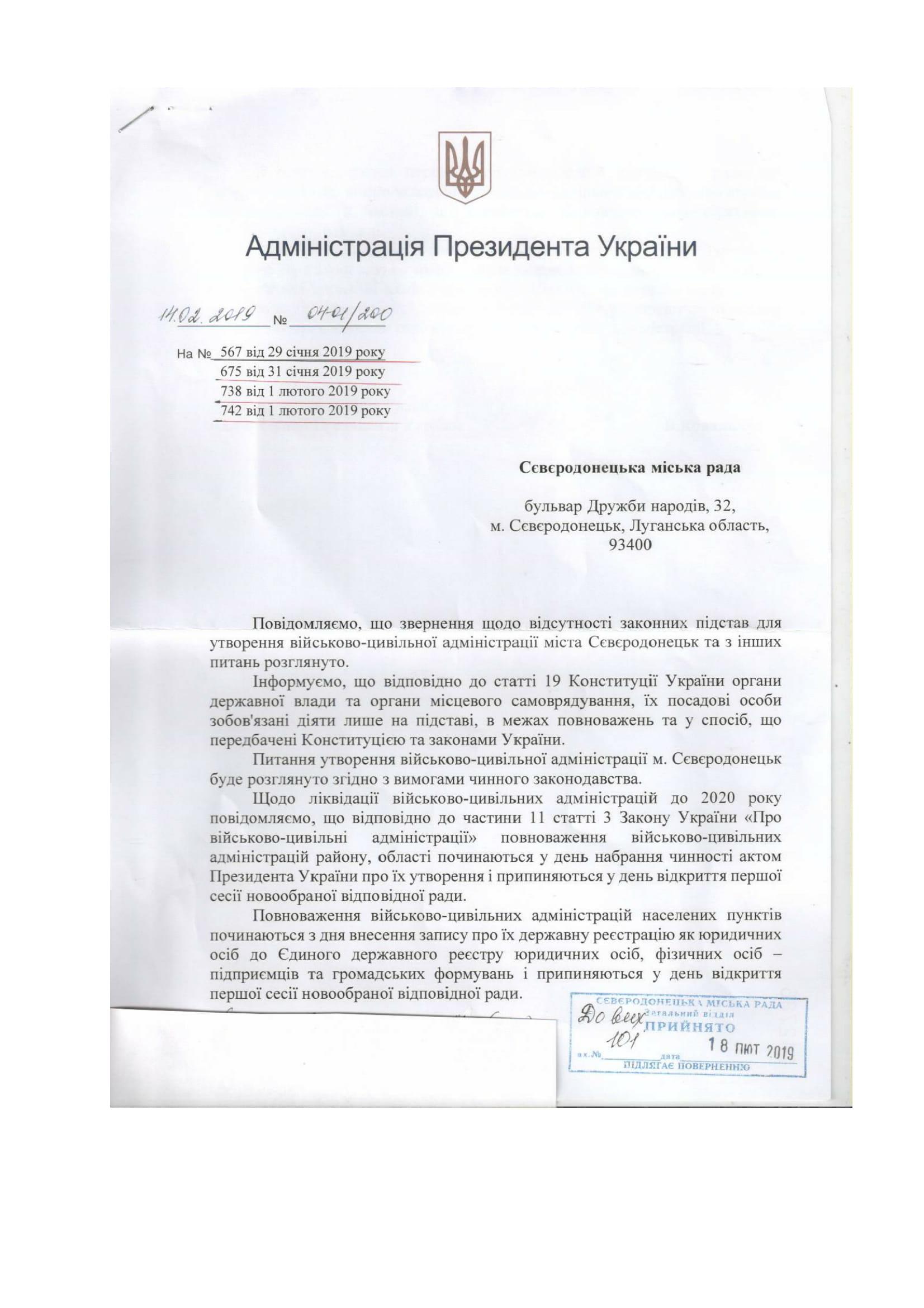 "На многочисленные обращения руководства, депутатов и членов исполкома Северодонецкого городского совета, а также общественности города к Президенту Украины Петру Порошенко относительно незаконных попыток и.о. председателя Луганской областной государственной администрации - областной военно-гражданской администрации Сергея Филя побудить Президента Украины ввести в Северодонецке военно-гражданскую администрацию (ВГА) от Администрации Президента Украины поступил официальный ответ (№04-01 / 200 от 14.02.2019), который мы публикуем для того, чтобы территориальная община Северодонецка ознакомилась с документом и сделала выводы", - сказано в сообщении.