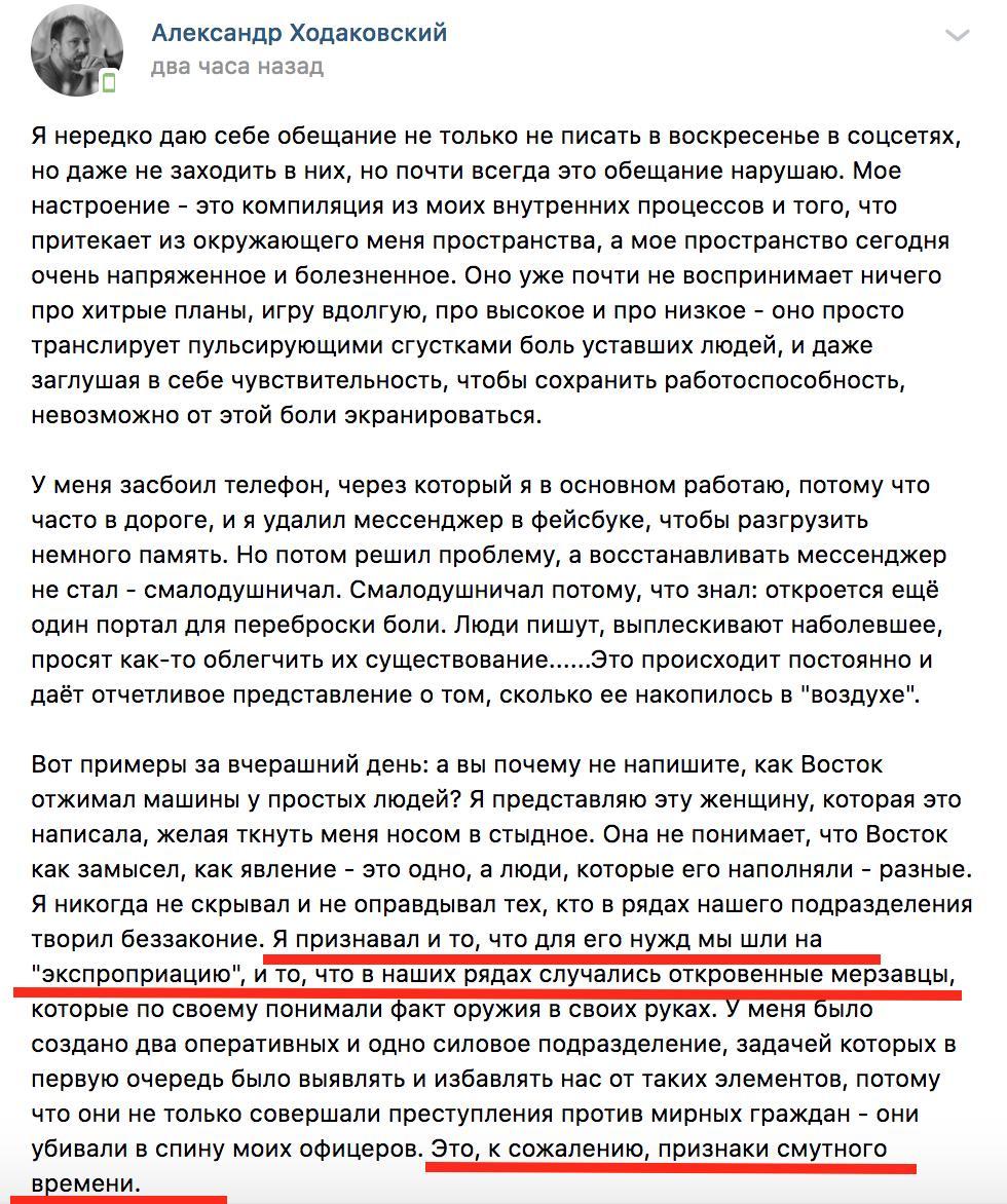 Ходаковский пишет, как занимался "экспроприациями" у тех жителей Донбасса, которых якобы защищал. И объясняет это спецификой "смутного времени", которое сам же и устроил.