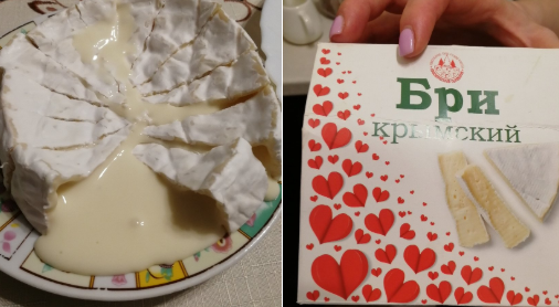 Как видно, сыр бри производства "Краснолесской сыроварни" оказался жидким внутри. При этом производитель радостно уверяет, что сыр изготовлен "по традиционным французским рецептам", поэтому санкции крымчанам "больше не страшны".