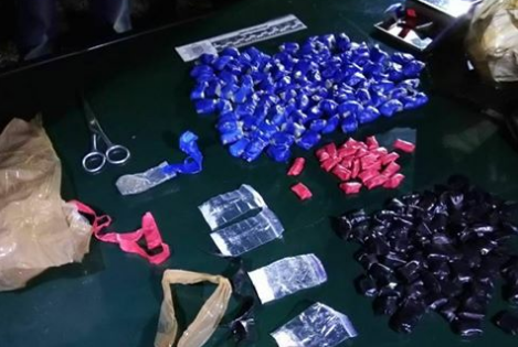 В пакетах следователями выявлено 99 свертков в синей изоляционной ленте с измельченной растительной веществом, похожим на каннабис, 25 свертков упакованных в красную изоляционную ленту с белым кристаллообразным веществом и 70 свертков в черной ленте с белым порошкообразным веществом, похожим на амфетамин.