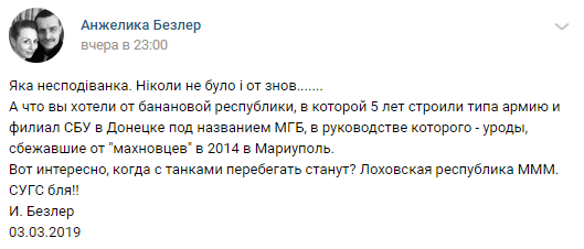 "То, что МГБ банановой республики - это филиал СБУ только слепой не видит, и то, что в прокуратуре банании работают откровенные враги, которые в 2014 прятались в Мариуполе и Киеве", - написал Безлер.
