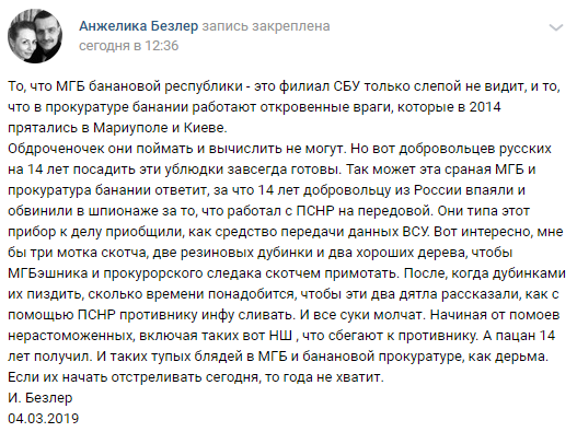 "И таких тупых б***й в МГБ и банановой прокуратуре, как дерьма. Если их начать отстреливать сегодня, то года не хватит", - написал боевик.