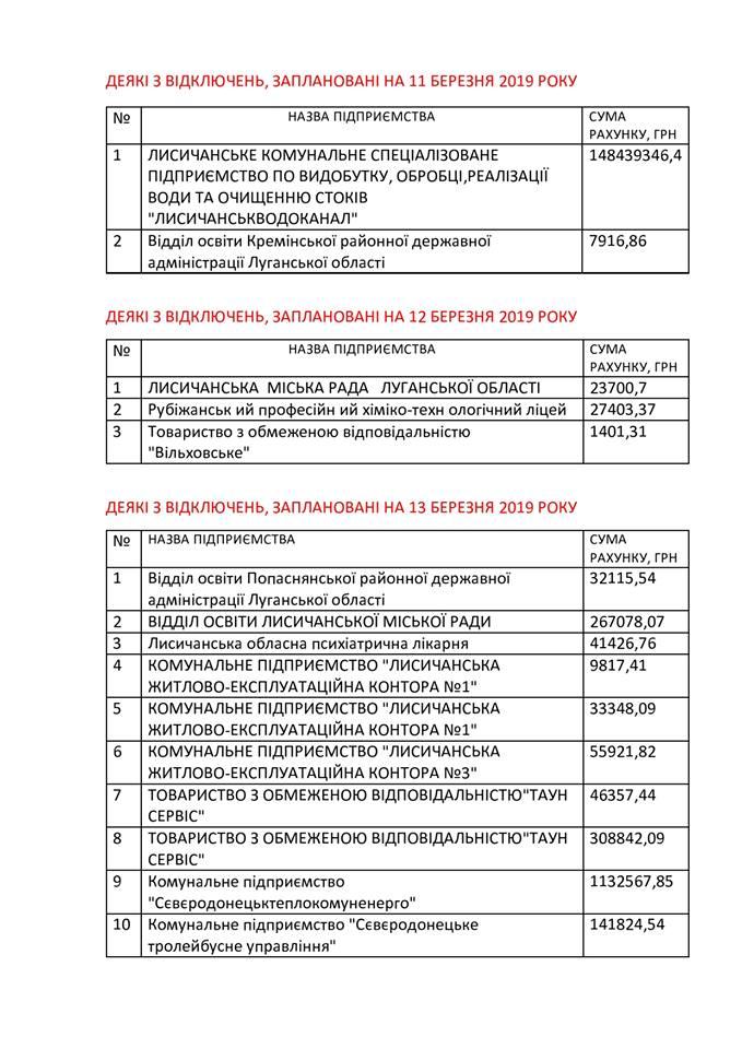 Также в течение ближайших трех дней ЛЭО отключит Лисичанский городской совет, ЖЭКи, Северодонецкое троллейбусное управление и т.д.