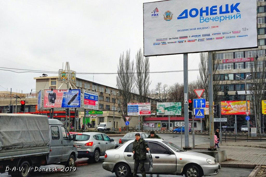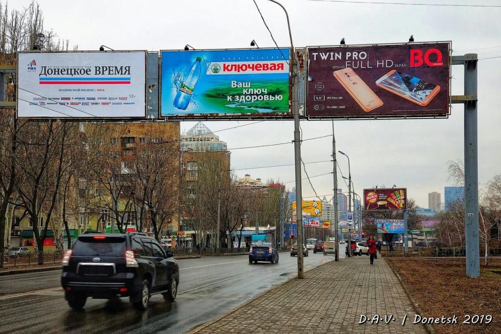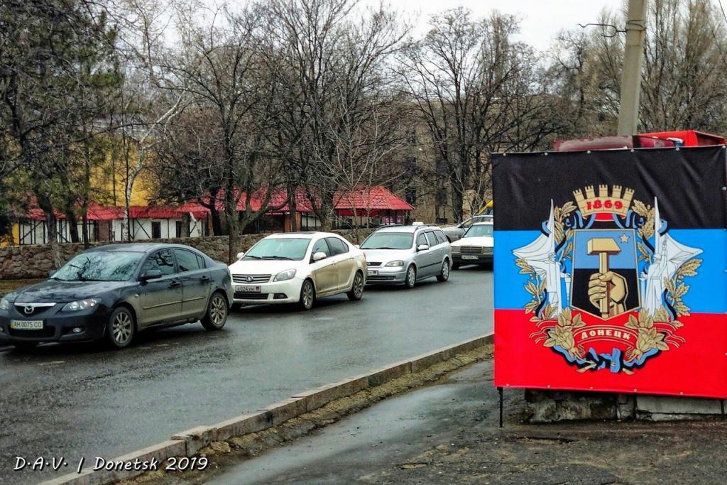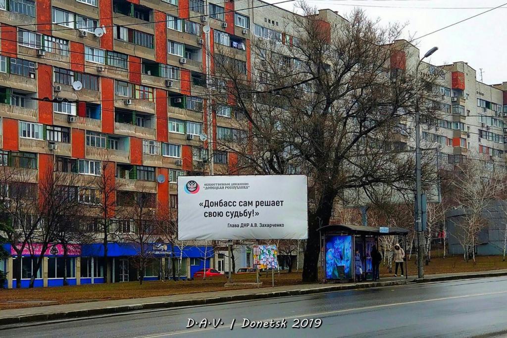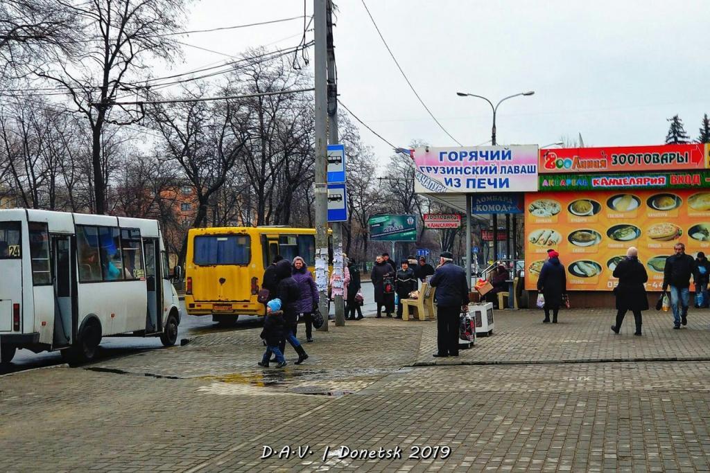 На фотографиях видны не слишком людные улицы, общественный транспорт, магазины. На улицах Донецка много сепаратистской символики так называемой "ДНР". Также там можно увидеть биллборды с высказываниями убитого главаря "ДНР" Александра Захарченко.