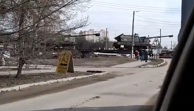 В Ростовской области России очевидцы сняли на видео эшелон с военной техникой.
