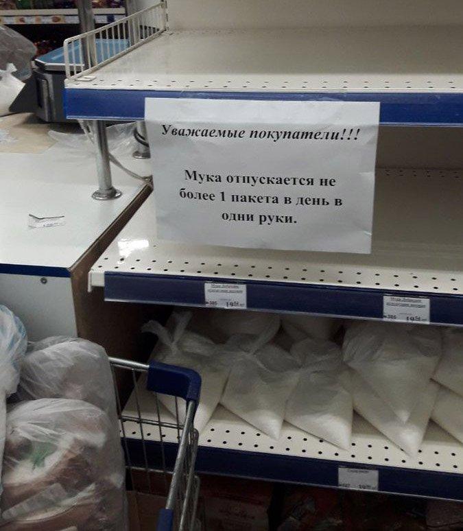 Вместо нее покупатели обнаружили объявление следующего содержания: "Мука отпускается не более 1 пакета в день в одни руки".