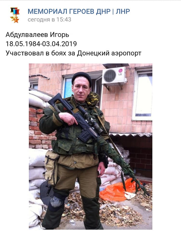 В тот же день, 3 апреля, был убит наемник Абдулвалеев Игорь с позывным "Абдула" из Челябинска. В боевых действиях против Украины он принимал участие с 2014 года, в частности участвовал в боях за Донецкий аэропорт.