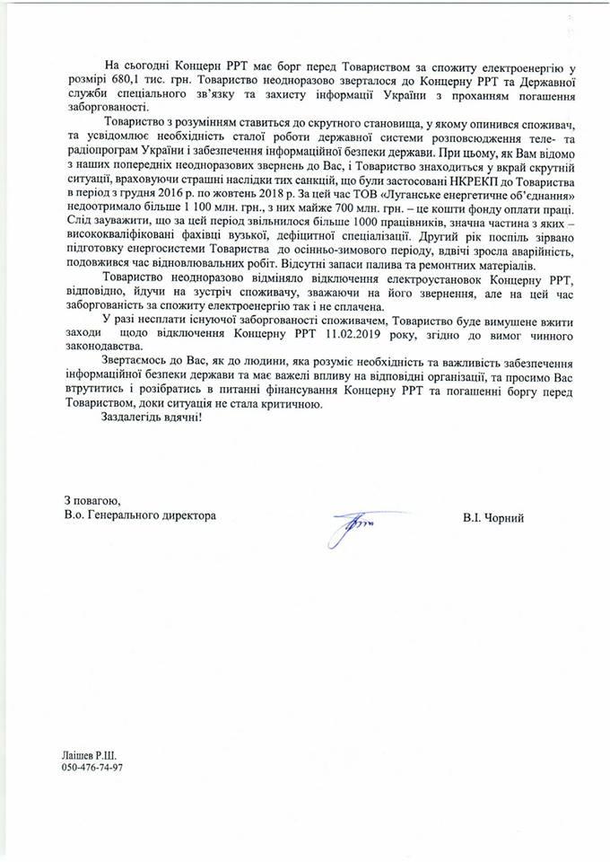 В письме к правительству ЛЭО сообщает, что неоднократно предупреждало концерн РРТ об отключении энергии, в связи с задолженностью в сумме 680,1 тысяч гривен, и неоднократно откладывало по срокам данное отключение, на что концерн каждый раз отвечал - средства отсутствуют.