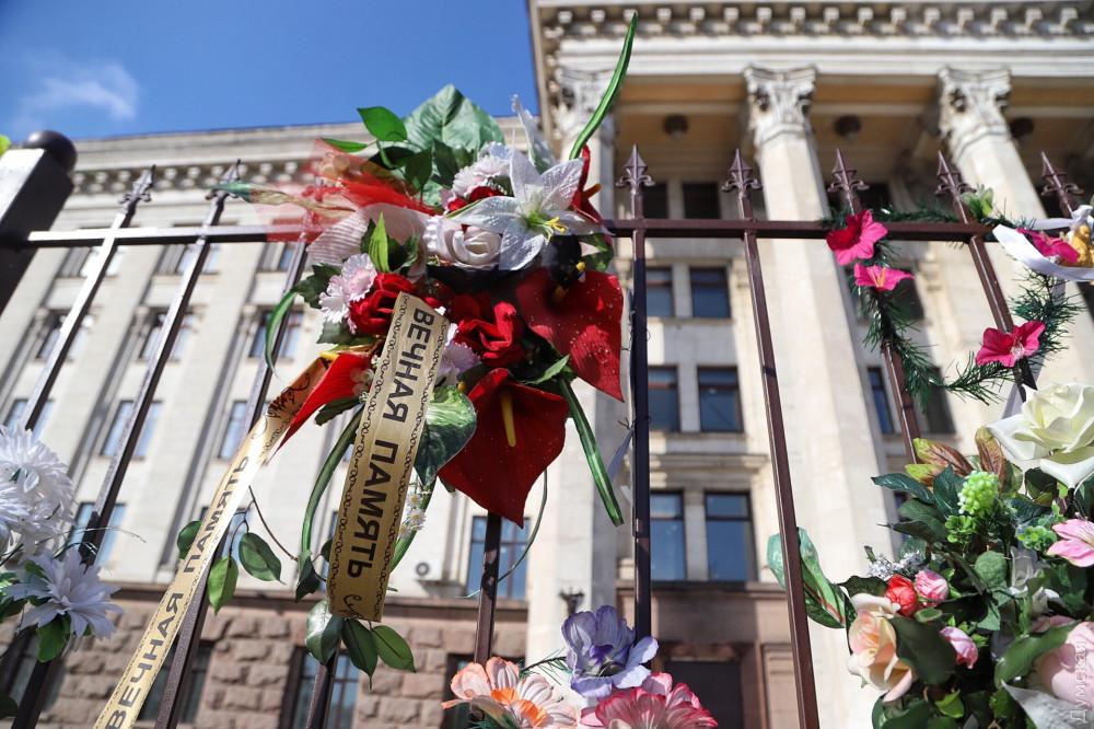 Люди идут к Дому профсоюзов с самого утра. На ограде вокруг Дома профсоюзов – венки и фотографии, рядом - живые цветы.