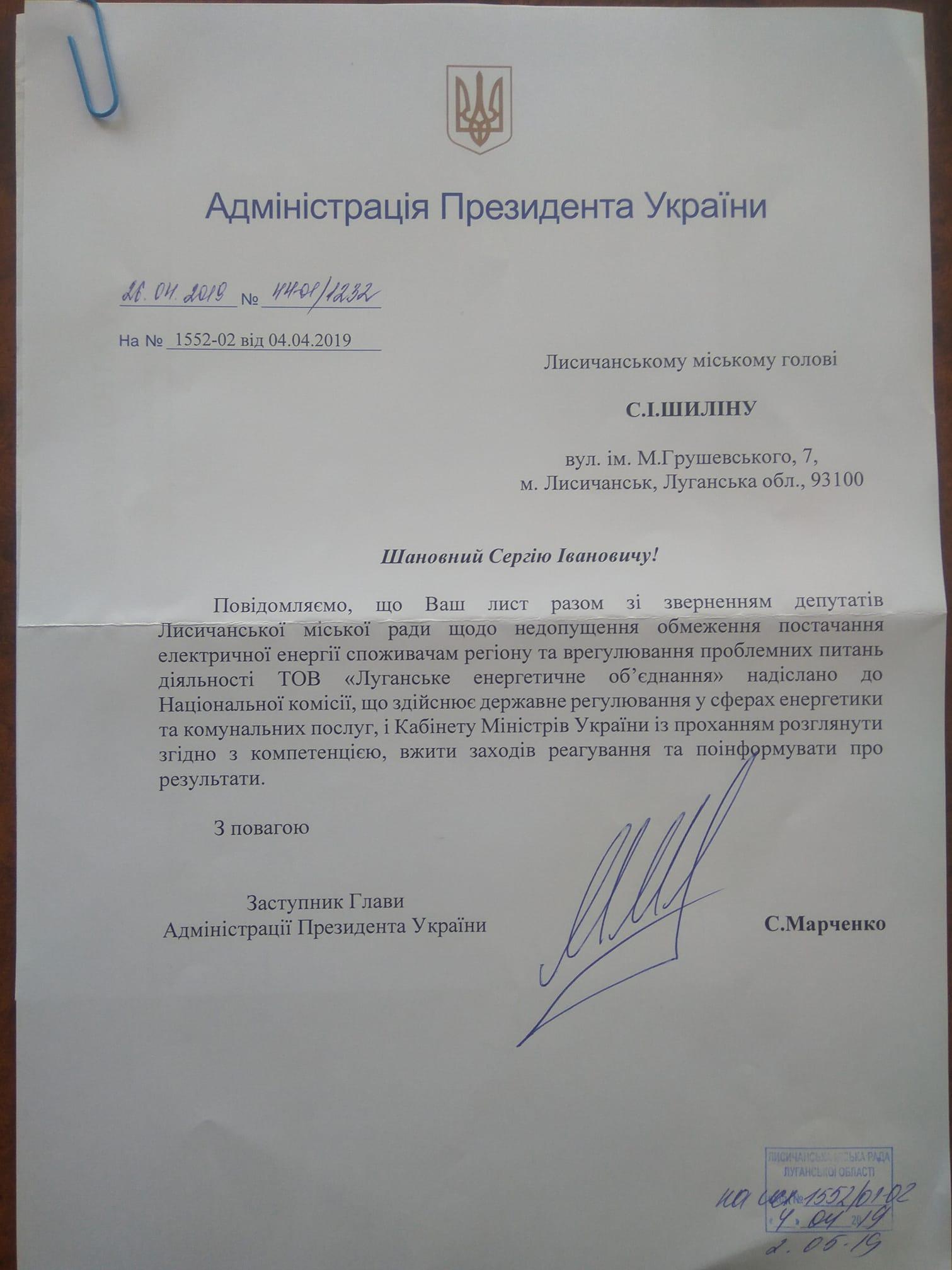 Виталий Шведов показал также письмо-подтверждение на имя городского головы, полученное из администрации президента, о том, что на проблему обесточивания водоканала обратили внимание и этим вопросом займется Национальная комиссия.