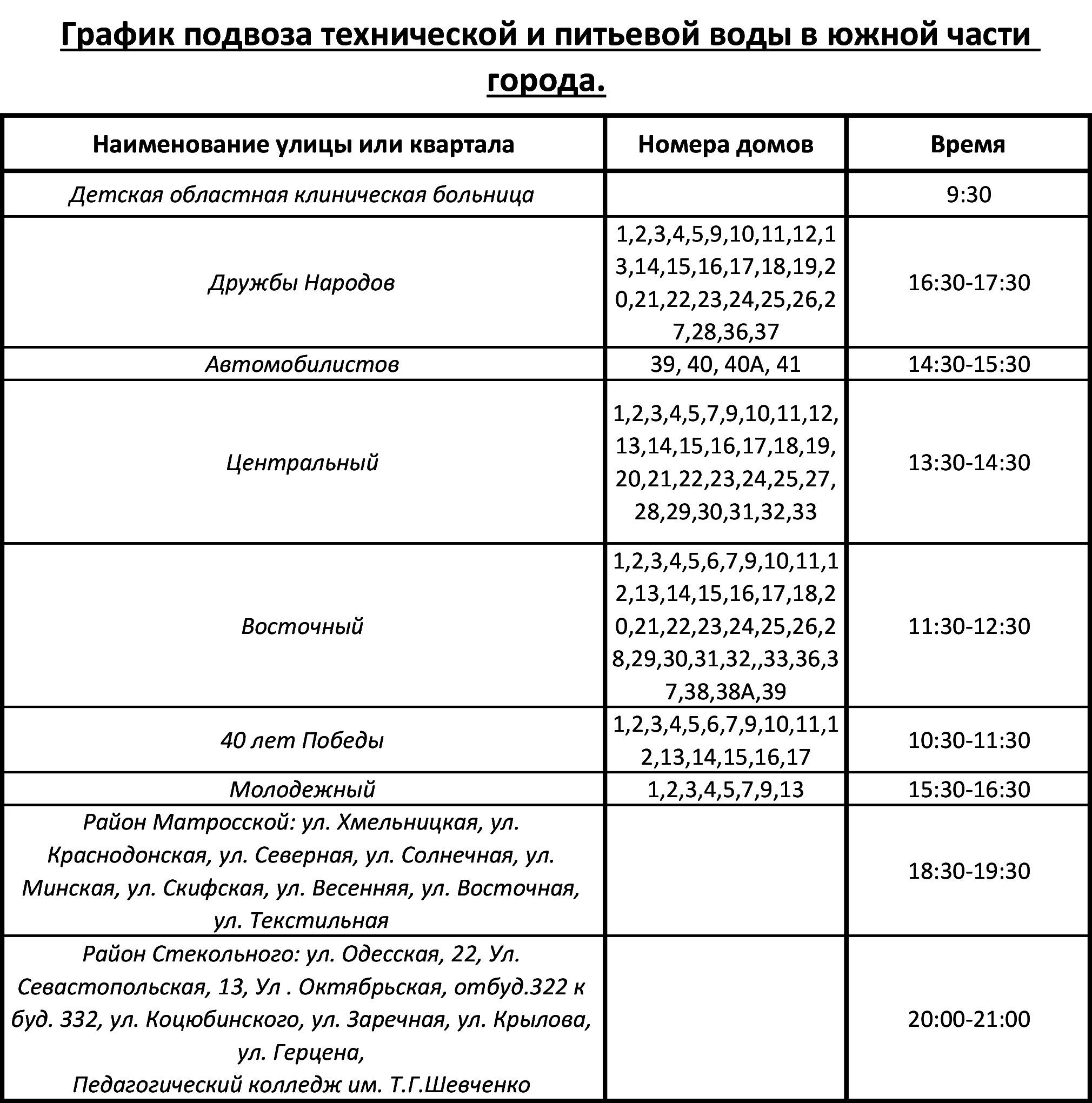 На официальном сайте Лисичанского водоканала сегодня опубликовали график подвоза технической и питьевой воды в южную часть города.