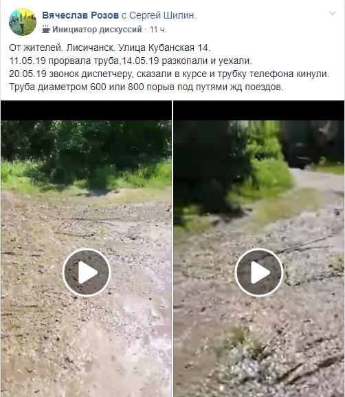 По словам горожанина, по улице прорвало трубу еще 11 мая. После чего работники "Лисичанскводоканала" раскопали землю и уехали.