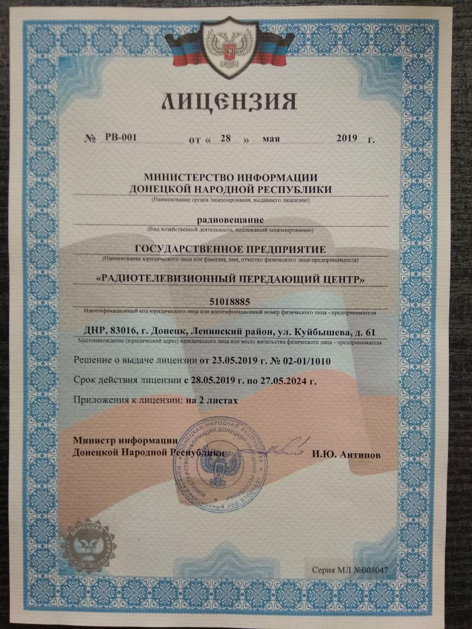 Сегодня наше ГП «Радиотелевизионный передающий центр» получило первую в "ДНР" лицензию на вещание от "Министерства" информации.