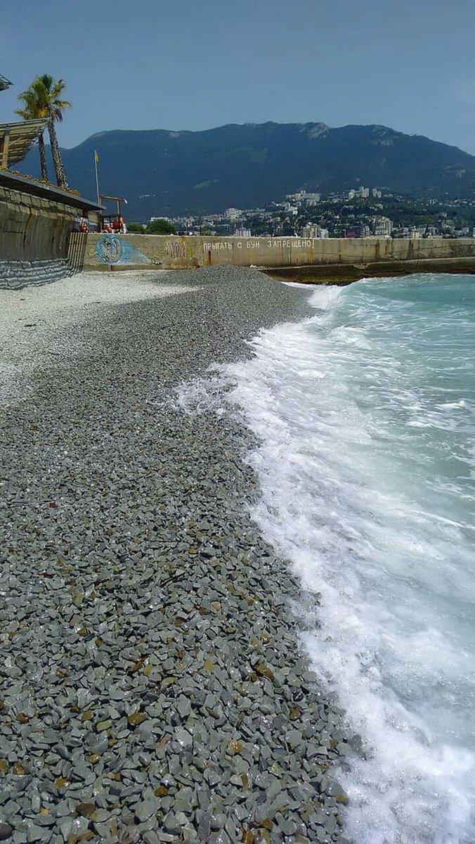 "Ялта. Пляжи подсыпали щебнем,который галькой стать не успел. В море босиком доползти невозможно - острый щебень. Но хоть особо и не пробует никто".