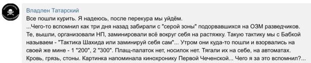 "Три дня назад забирали с "серой зоны" подорвавшихся на ОЗМ разведчиков. Те вышли, организовали НП, заминировали все вокруг себя на растяжку. Такую тактику мы с Бабкой называем "Тактика Шахида или заминируй себя сам"... Утром они куда-то пошли и взорвались на своей же мине", - рассказал террорист.