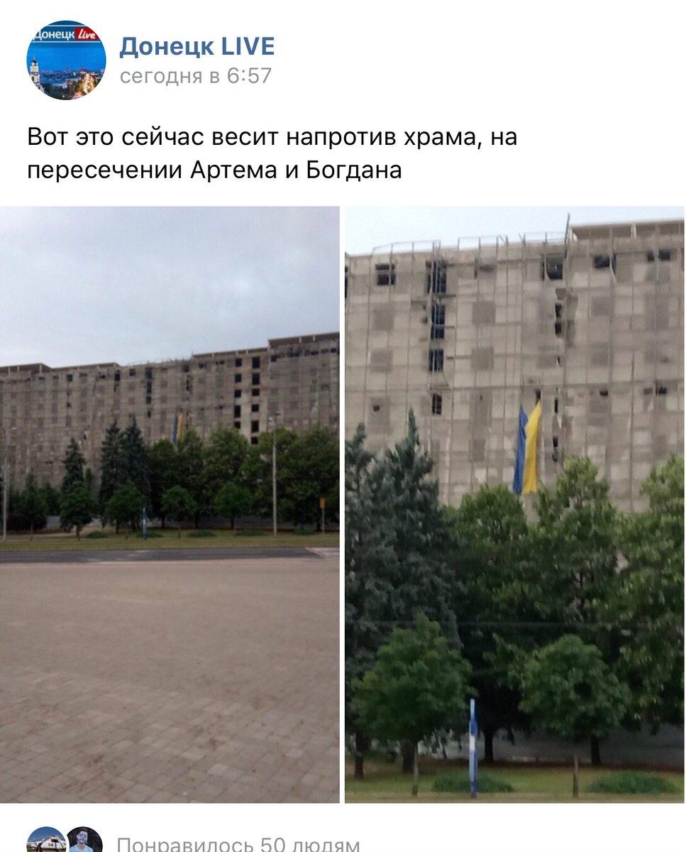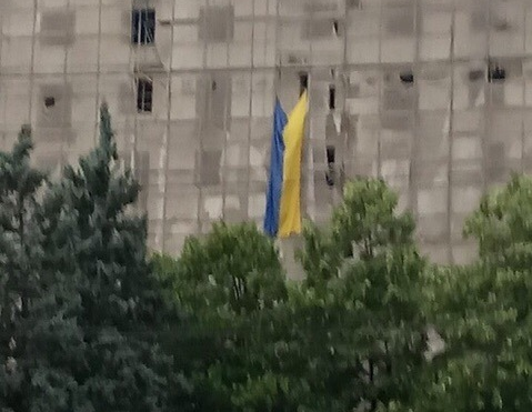 Так, журналист Денис Казанский поделился скрином, на котором видно, что на заброшенном здании донецкой гостиницы вывешен украинский флаг.