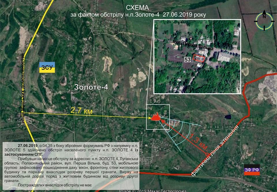 "27 июня, в 04.35 утра, вооруженные формирования РФ с направления Золотое-5 обстреляли населенный пункт Золотое-4 из станкового противотанкового гранатомета", - говорится в сообщении.