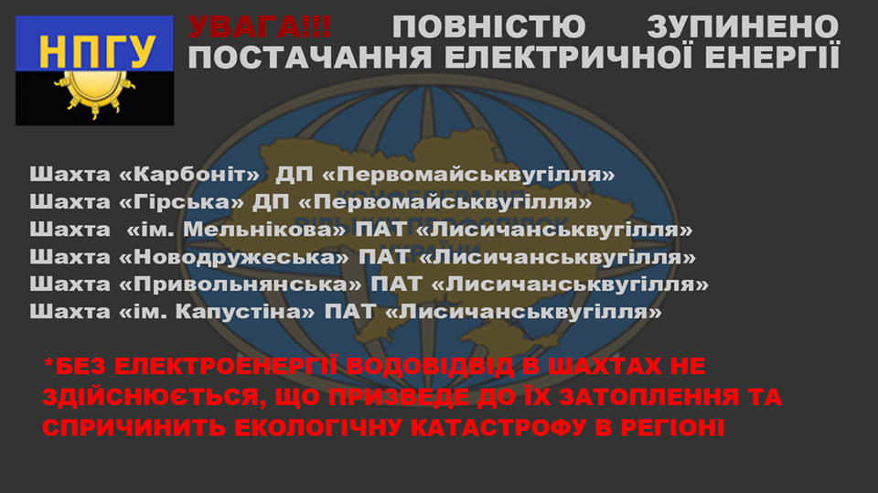 Также он отметил, что сегодня в 12 часов были полностью обесточены шахты ГП «Лисичанскуголь» (им. Мельникова, им. Капустина, "Новодружеская", "Привольнянская") и шахта «Карбонит» ГП «Первомайскуголь». На предприятиях не работают водоотлив и аварийные системы. Волынец предупредил, что затопление шахт приведет к экологической катастрофе в регионе.