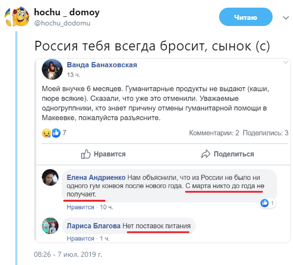Так, местные жители пишут, что в Макеевке отменили выдачу гуманитарного детского питания. На вопрос о причинах такого явления комментаторы написали, что с начала нынешнего года Россия не прислала в ОРДЛО ни одного "гуманитарного конвоя".