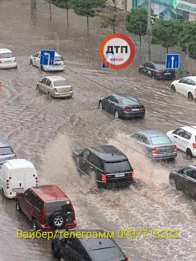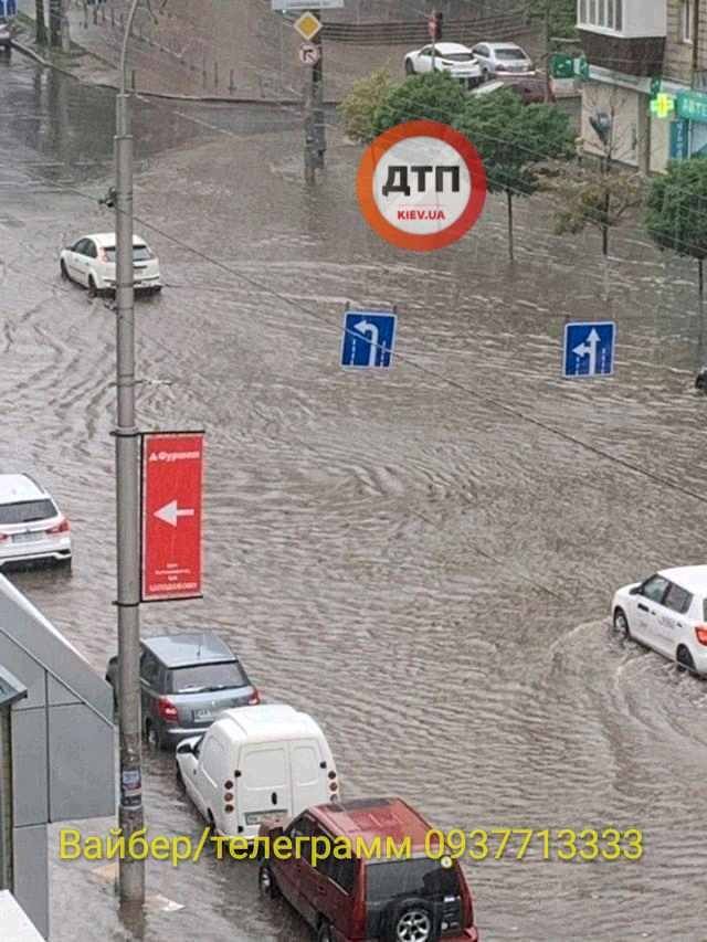 Потоп наблюдается на улице Антоновича пред Оушен-плазой, подтопило также Скоростной и Индустриальный.