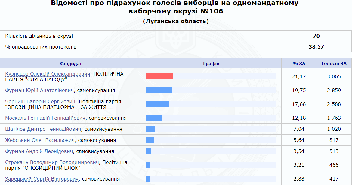 Кузнецов пока набирает 21,17% голосов. Всего на полтора процента от него отстает самовыдвиженец Юрий Фурман - член партии Сергея Шахова "Наш край", сейчас он набирает 19,75%. На третьем месте - представитель "Оппозиционной платформы - За жизнь" Валерий Черныш (17,88%). Четвертым идет бывший глава Луганской ОГА Геннадий Москаль (12,18%).