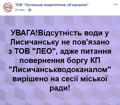 !Внимание! Отсутствие воды в Лисичанске не связано с ООО "ЛЭО", поскольку вопрос возврата долга КП "Лисичанскводоканал" решен на сессии городского совета!" - сообщается на странице ЛЭО в Фейсбуке.