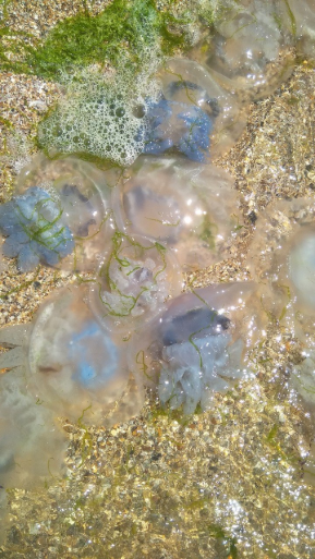 "Щелкино. Море мертвых медуз и никого... Что то в Азовском море неправильно. Таки угробят нам экологию скрепой своей в виде моста", - написала блогер.