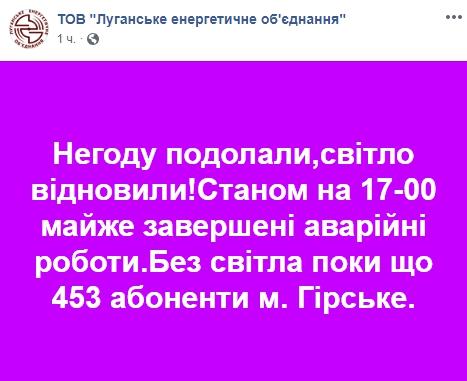"Непогоду преодолели,свет восстановили! По состоянию на 17:00 почти завершены аварийные работы.Без света пока 453 абонента города Горское", - написали в пресс-службе в 17:24.