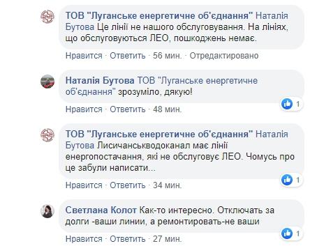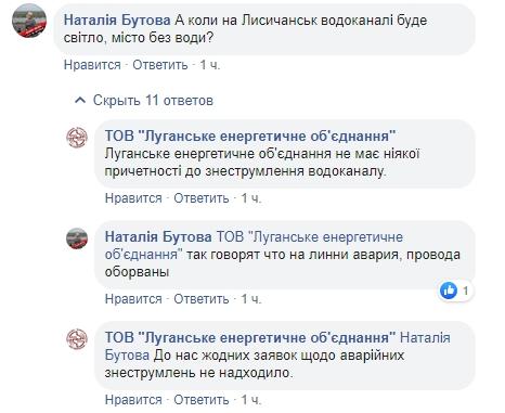 "А когда в Лисичанскводоканале будет свет, город без воды?", "Утром звонила диспетчеру, сказали, что восстанавливают провода, поэтому нет воды".