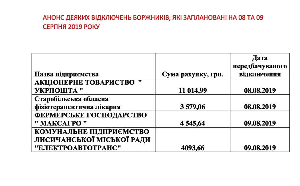 Анонс отключения некоторых должников обнародован на Фейсбук-странице ЛЭО. Сообщается, что "Электроавтотранс" будет обесточен 9 августа, в пятницу. Также в очереди на отключение АО "Укрпошта", фермерское хозяйство "МАКСАГРО" и больница в Старобельске.