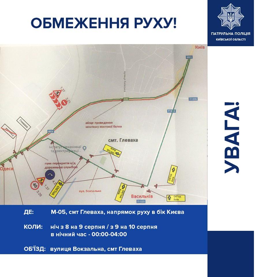 В связи с проведением строительства надземного пешеходного перехода на автомобильной дороге М-05 Киев-Одесса км 27+500, а именно устройства мостовой балки, временно будет ограничено движение в направлении из города Одесса на город Киев.