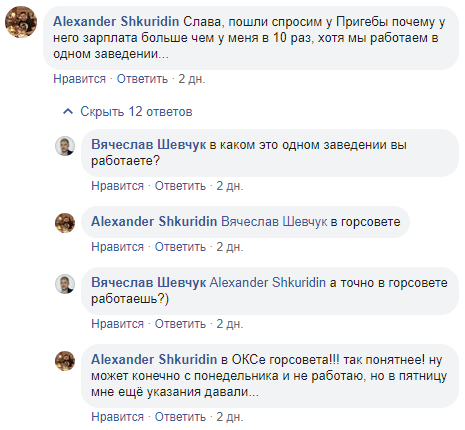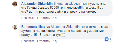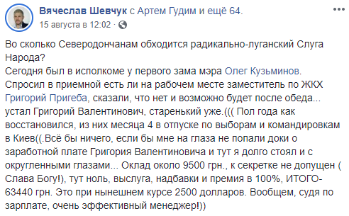 Сегодня был в исполкоме у первого зама мэра Олега Кузьминова. Спросил в приемной есть ли на рабочем месте заместитель по ЖКХ Григорий Пригеба, сказали, что нет и возможно будет после обеда... устал Григорий Валентинович, старенький уже.((( Пол года как восстановился, из них месяца 4 в отпуске по выборам и командировкам в Киев((. Всё бы ничего, если бы мне на глаза не попали доки о заработной плате Григория Валентиновича и тут я долго стоял и с округленными глазами... Оклад около 9500 грн., к секретке не допущен (Слава Богу!), тут ноль, выслуга, надбавки и премия в 100%, ИТОГО - 63440 грн. Это при нынешнем курсе 2500 долларов. В общем, судя по зарплате, очень эффективный менеджер!))" - написал Шевчук.