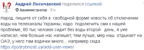 В Лисичанске Луганской области вот уже вторые сутки нет воды. Но, как говорится, "спасение утопающих - дело рук самих утопающих": отчаявшиеся лисичане пишут свои обращения в топовые медиаресурсы, чтобы на их проблему обратили внимание вышестоящие чиновники.