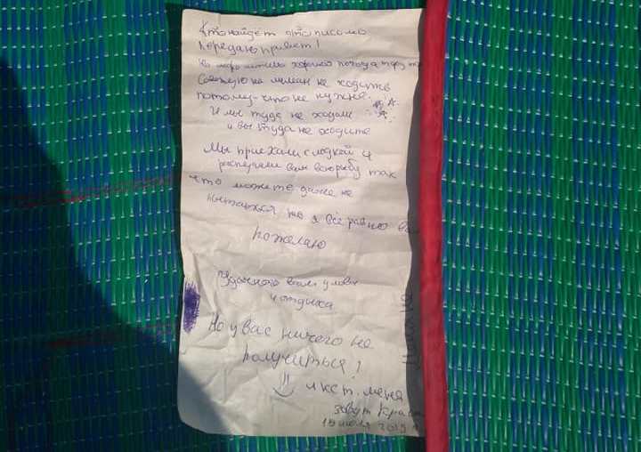 В письме некая Кристина пишет, что не нужно ходить на лиман, потому что они приехали с лодкой и распугали всю рыбу. Девушка желает своему неизвестному адресату удачного улова и отдыха, но в конце пишет, что все равно "ничего не получится".