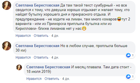 Автор поста отметила, что лиманов поблизости нет, а значит, бутылка приплыла из Приморска или Кирилловки. В письме стоит дата 18 июля 2019 года, т.е. бутылка плавала в море не меньше месяца.