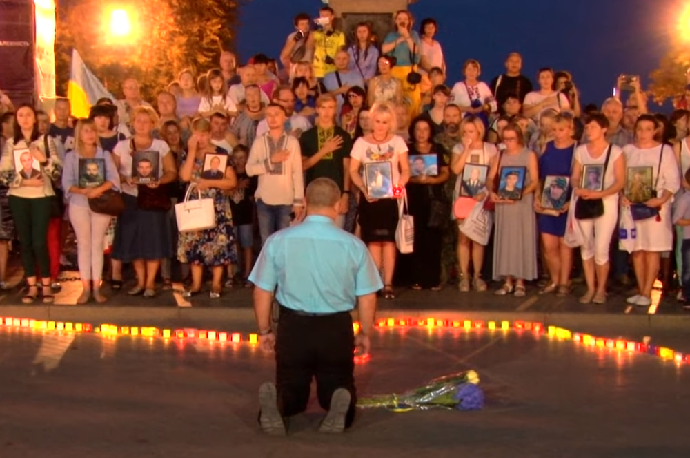 Под конец акции в центр карты вышел инженер из Москвы Константин Тычина. В руках он держал букет в цветах украинского флага. Мужчина стал на колени перед матерями, женами и детьми погибших военных.